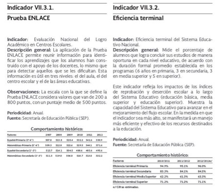 Por último, un aspecto muy significativo es que en el PND no se contemplan más que dos indicadores para la meta de “Educación de calidad”, en la que también el aspecto cultural se encuentra incluido. Los indicadores se refieren a la llamada prueba enlace y a la eficiencia terminal del Sistema Educativo Nacional. El único indicador que propiamente estaría ligado a la cuestión de la formación artística es el segundo, que da cuenta únicamente del número de egresados de los diferentes niveles educativos.