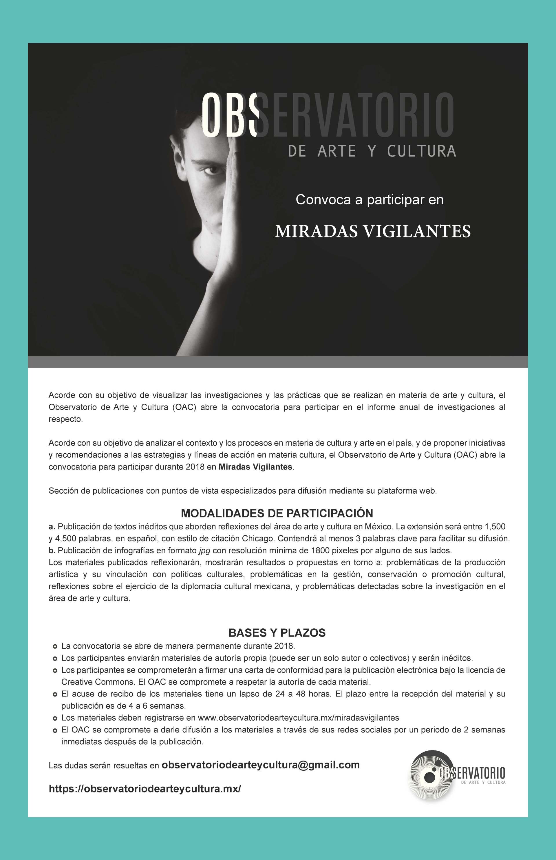 - Durante 2018 la plataforma web observatoriodearteycultura.org se propone vincular nuevos actores a las actividades en curso, a través de las convocatorias publicadas aquí.